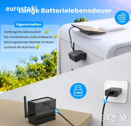 Удължен живот на батерията със слънчева енергия. Камерата за заден ход с монитор AUTO-VOX има соларен панел, който се зарежда ефективно в слънчеви дни и удължава живота на батерията за дълги пътувания. При слаба слънчева светлина или през зимата, тя поддържа и USB зареждане.