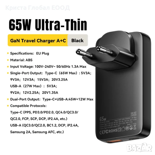 мощността от 65 W бързо ще зареди оборудването. В допълнение,