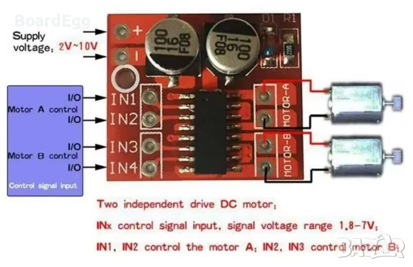- Захранване на мотори: 2V – 10V DC
