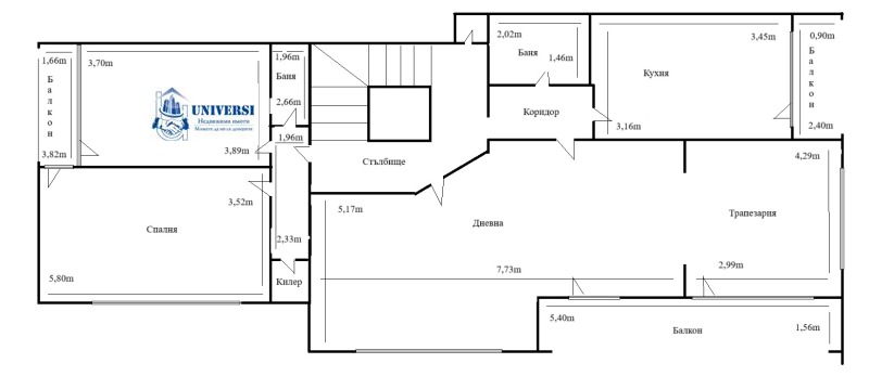Основната къща се състои от четири нива, разпределени като самостоятелни тристайни апартаменти, с площ от 118,43 м2. Третото ниво е със скосявания. Сутеренът на къщата отново е с площ от 118,43, със стандартна височина и малки прозорци, от които влиза слънчева светлина.