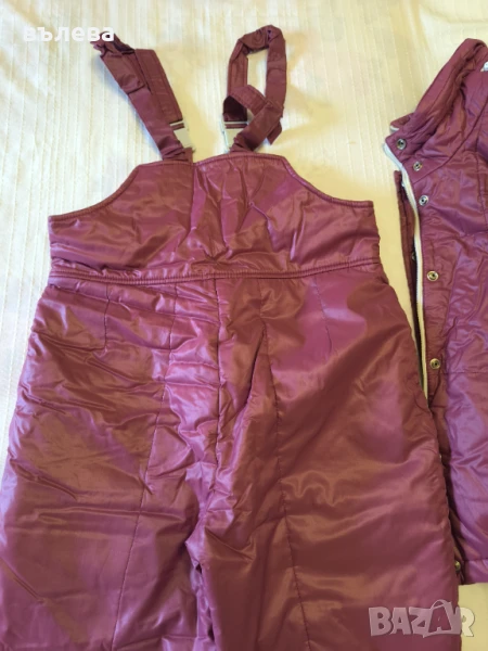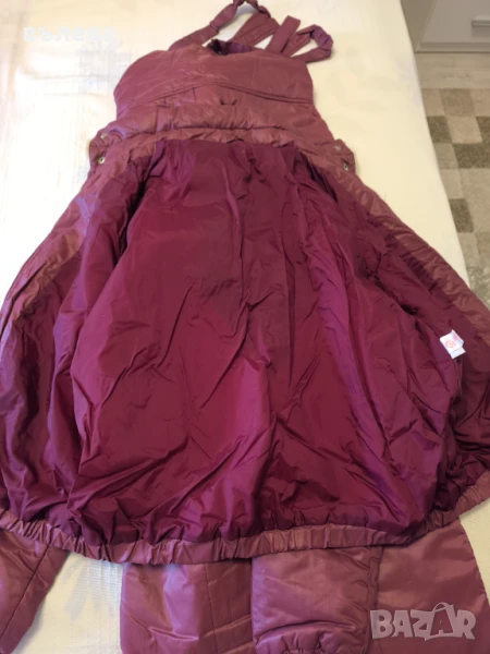 Зимен комплект - яке и гащеризон, подходящ за ски, туризъм и екскурзии.Красив цвят бордо.Яке: дължина 56см, гръдна обиколка 116см,талия 100см, дължина на ръкава 60см. Има качулка. Гащеризон: дължина без презрамките 125см, дължина на крачола 76см, широчина на крачола 60см, ханш 110см, талия 88см,два джоба с ципове., ластик в талията отзад.Обличан 2-3 пъти!