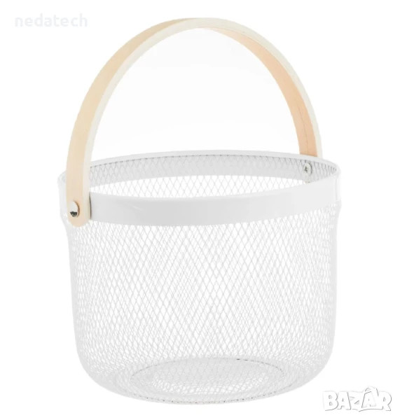 Кръгла перфорирана метална кошница в бял цвят с дървена дръжка в естествен цвят за лесно пренасяне. Идеален е за организиране и съхранение на малки предмети в кухнята, банята, килера или спалнята.