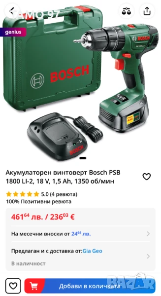 Продавам акумулаторен ударен винтоверт на Бош от зелената серия като нов, както се вижда на снимките използван броени пъти и работи перфектно, оригинално унгарско производство внос от Франция. Обявената цена включва машината, една батерия 18V 2.5AH, зарядно устройство и оригинален куфар. Пращаме с опция преглед и тест с куриерска фирма еконт може и лично предаване за гр. Шумен. Магазинската цена е: 461лв.