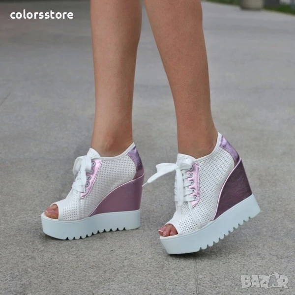 Летни боти на платформа - бяло с розово лъскава кожа - K222