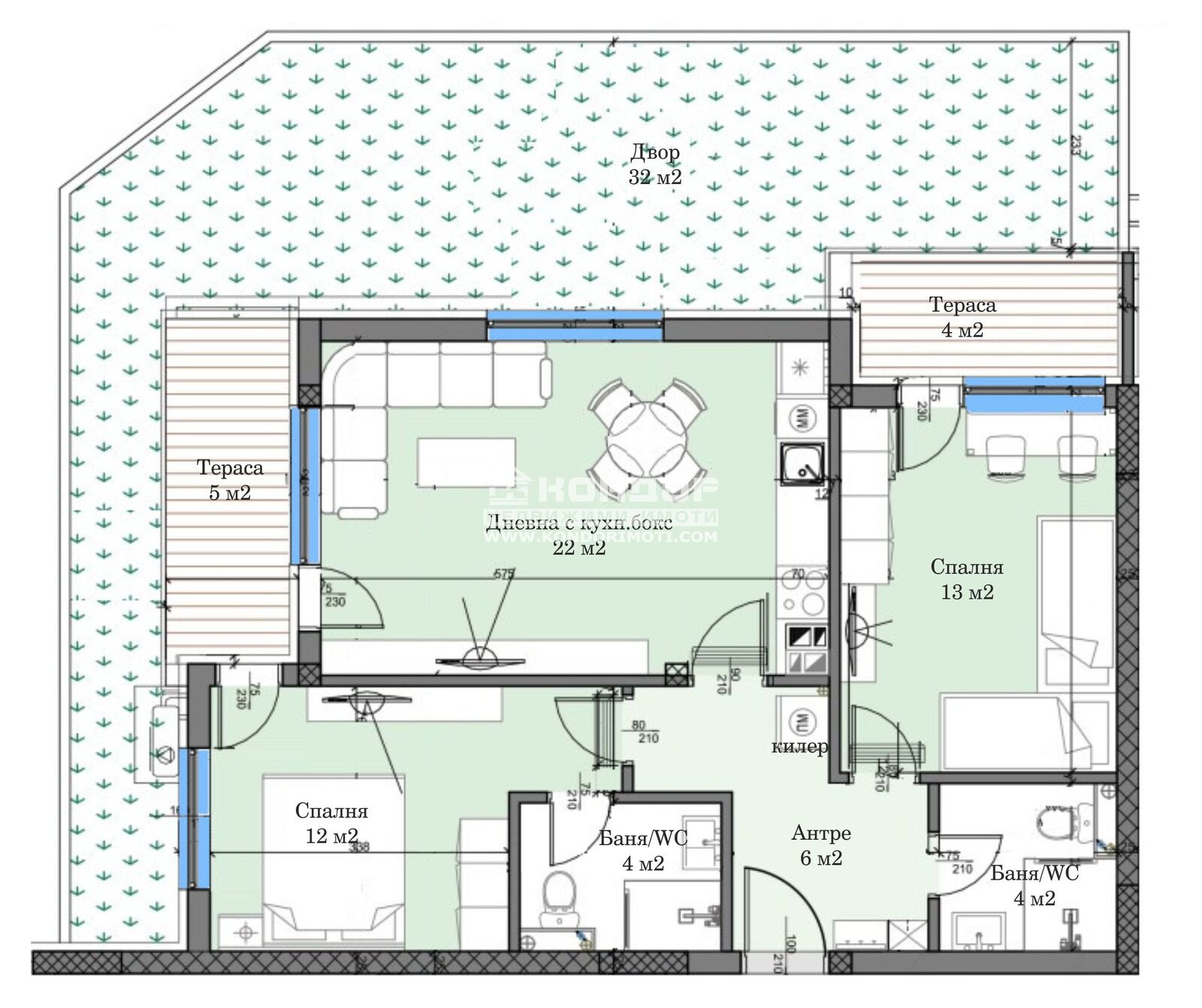 Оферта 67506: Бутиков затворен жилищен комплекс с модерна и устойчива архитектура, потопена в богато озеленени площи, вдъхващи на живущите комфорт и спокойствие. Комплекса предлага просторна спокойна среда с бърз достъп до центъра на града, както и възлови булеварди. Предлагаме ви тристаен апартамент, състои се от светла ъглова дневна с трапезария и кухненска част 22кв.м., две самостоятелни спални: родителска 12кв.м. със собствена баня и детска 13кв.м., втори санитарен възел, входно антре, две веранди и собствен двор 32кв.м. В близост са ситуирани ресторанти, хипермаркети, училища и детски градини. Ще бъдат изградени луксозни общи части с предоставено облагородено дворно място, пейки за отдих и детски площадки за игра. Апартаментите ще бъдат издадени на: Стени и тавани гипсова мазилка, Под - циментова замазка; Под в санитарни помещение циментова замазка; Стени в санитарни помещения вароциментова мазилка, Тераси /под/ - мразоустойчив гранитогрес. Входни врати на апартаменти блиндирани.ВИЖТЕ ОЩЕ ИЗГОДНИ ОФЕРТИ НА https://www.kondorimoti.com/ С ЕЖЕДНЕВНА АКТУАЛИЗАЦИЯ!