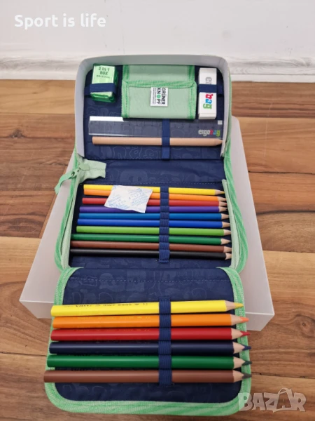 - Твърд моливник, оборудван с моливи, острилка, гумичка, училищна програма и портмоне