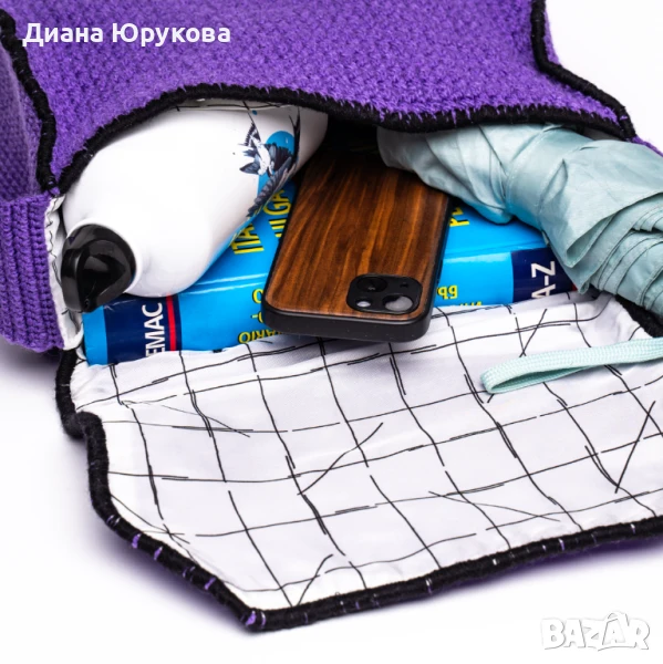 Прекрасна ръчно изработена с много любов дамска чанта. Изплетена е на една кука от акрилна прежда. Чантата е с полиестерен хастар. Има 4 джоба за по-добро аранжиране на съдържанието. Дъното й е подсилено с вградена подложка от рециклирани текстилни материали за да запази формата си при носене. Чантата е много удобна и лека. Тя е с лесно поддържаща се хигиена и е трайна.