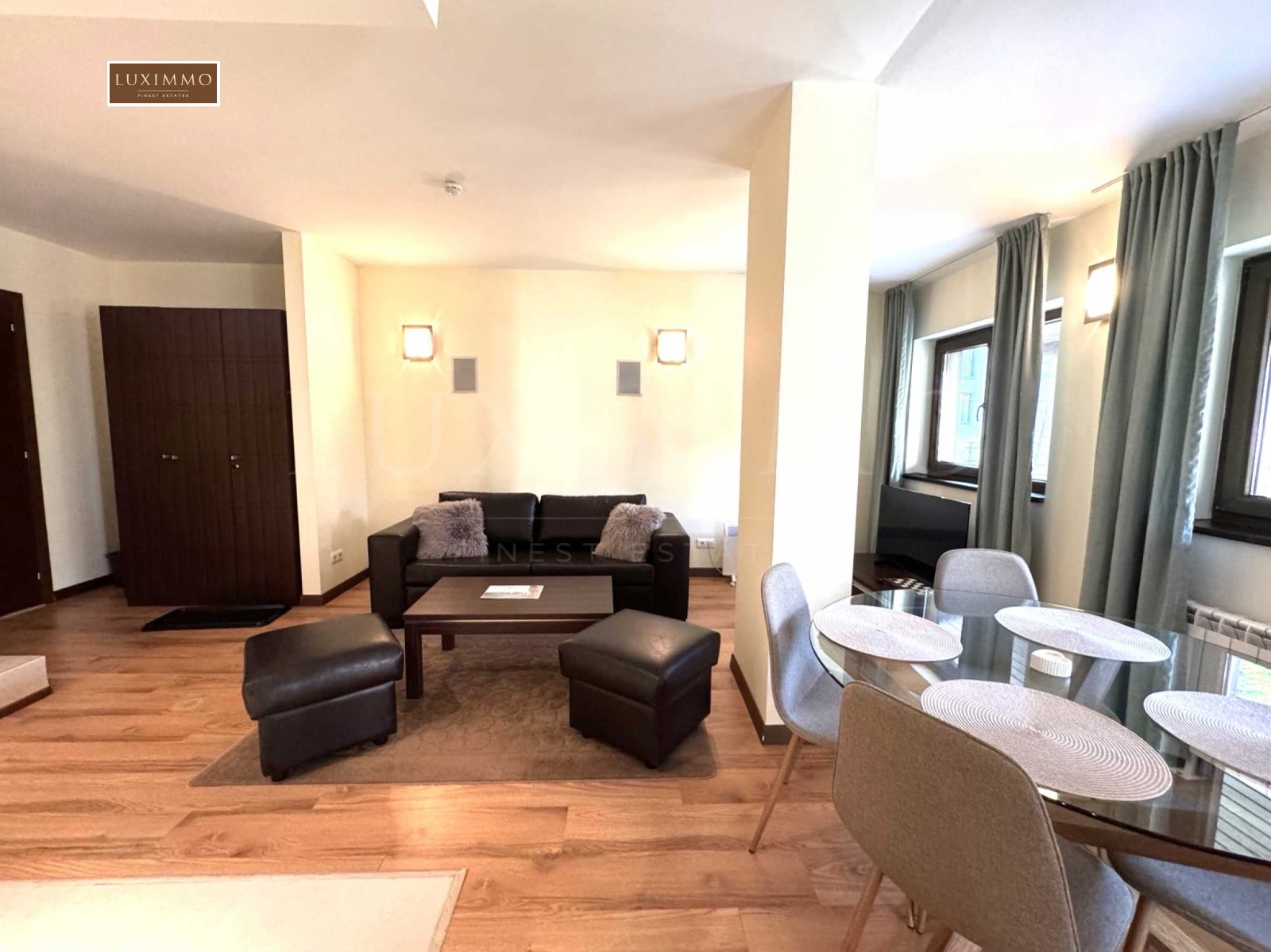 Просторна дневна с гардероб, диван, холна маса, телевизор, маса за хранене;