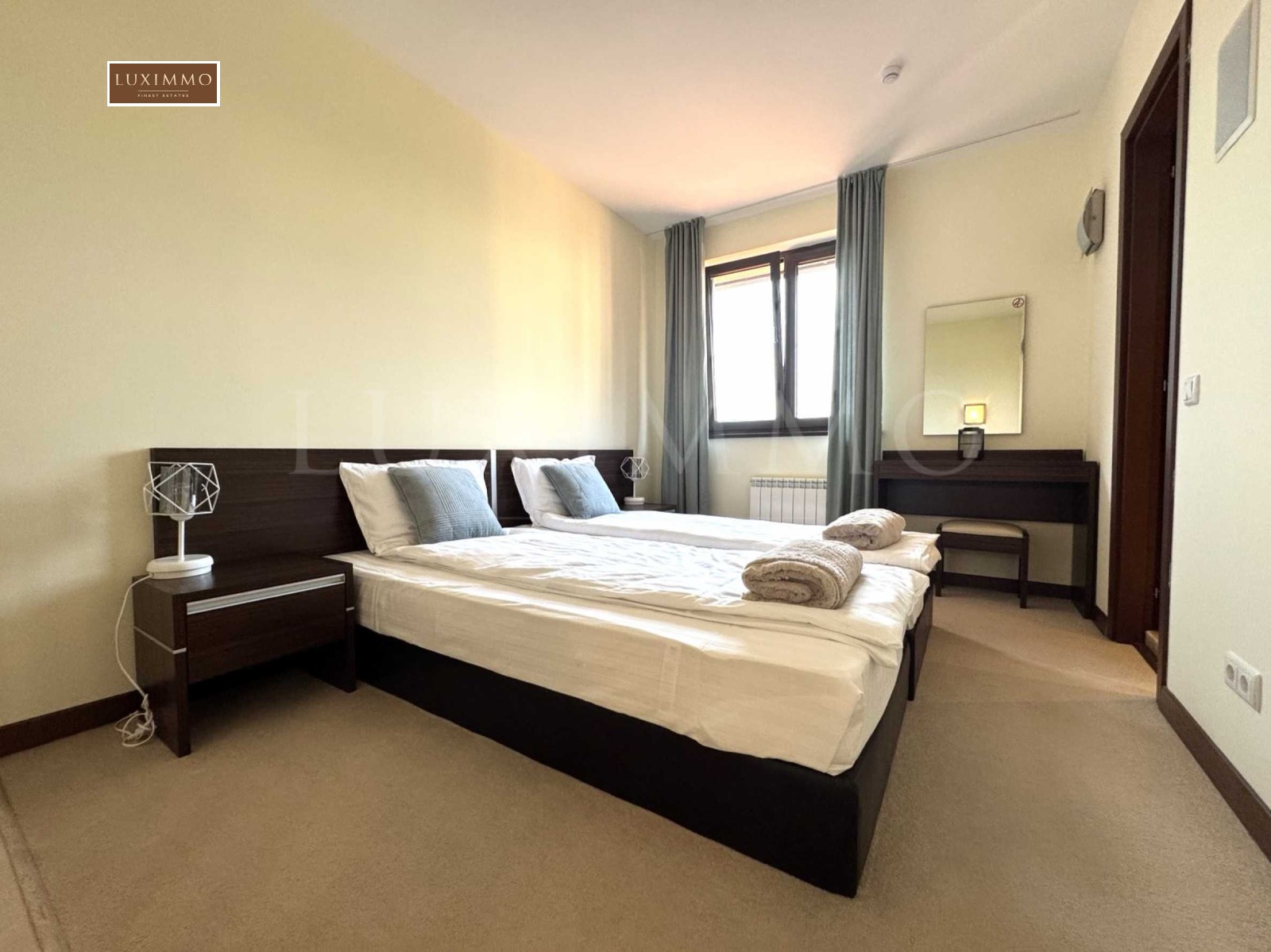 Спалня с два единични матрака, нощни шкафчета и тоалетка;
