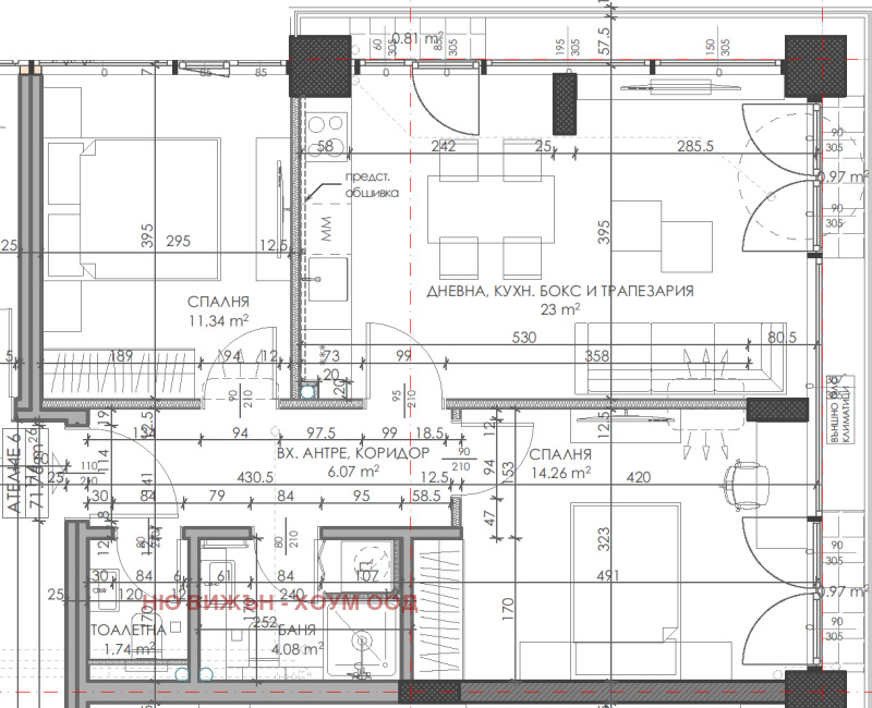 баня 2 7,40 м2, антре 11,73 м2, тераса 3,13 м2) . Обща площ 126,18 кв.м. с вкл. общи части и застроена площ 107,96 кв.м.