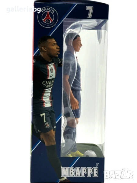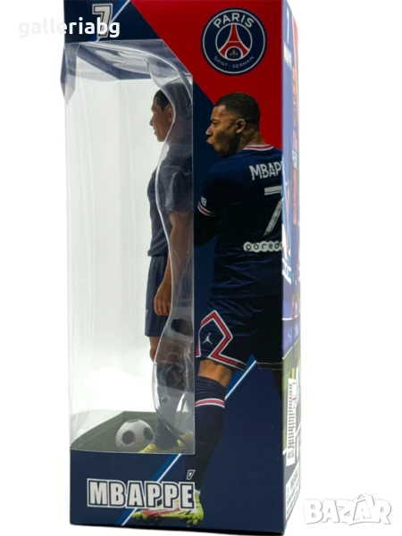 Фигурка на световноизвестния футболист Kylian Mbappé, облечен в екипа на Paris Saint-Germain. Моделът е представен в кутия с прозрачен панел и автентичен дизайн. Фигурката е с номер 7 и футболна топка в основата – идеално допълнение за колекция или тематичен подарък за футболни фенове.
