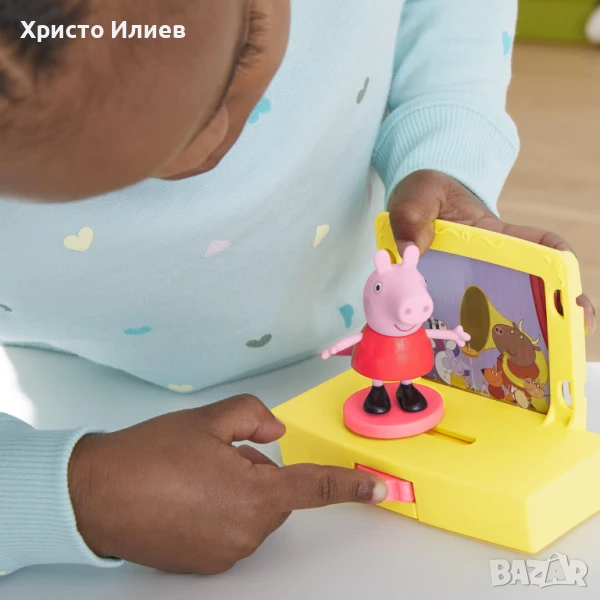 Има и сцена с двустранен фон, върху който децата могат да поставят всяка 7см фигура, която ще се движи, като въртят циферблата. С 3 фигурки и 9 аксесоара, този подаръчен комплект със сигурност ще развълнува всеки любител на Пепа!