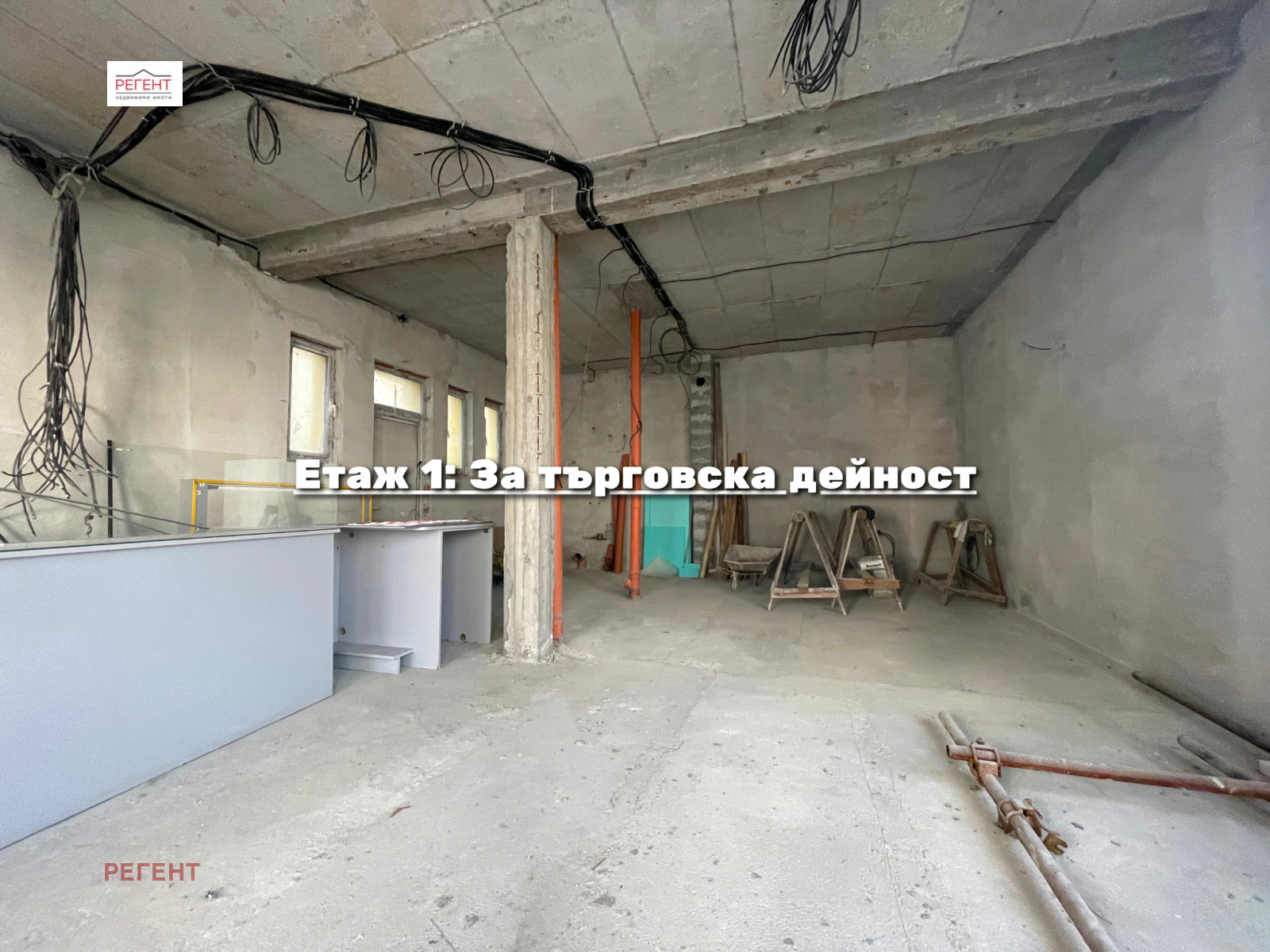 Имотът се намира в двуетажна сграда със смесено предназначение, с още три самостоятелни обекта. На първия етаж са разположени две помещения едното с площ от 66 м2, с директен достъп от улицата и товарен вход, подходящо за търговска дейност, а другото с площ от 51 м2, в задната част на сградата, с прилежащ двор и предназначение за обществено хранене. Вторият етаж включва два офисни обекта първият с площ от 81 м2, с изглед към улицата и просторна тераса, а вторият 43 м2, ориентиран към вътрешния двор и разполагащ с две тераси. Около сградата са налични паркоместа.