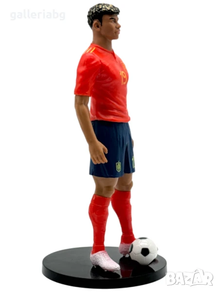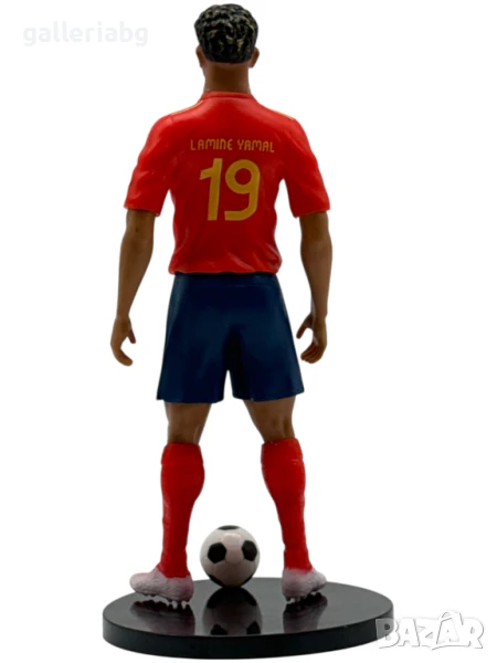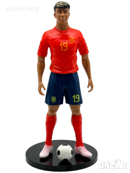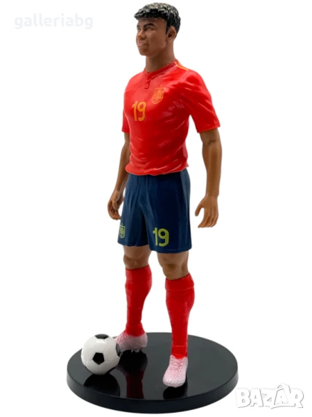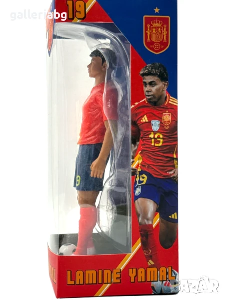 Фигурка на младата футболна сензация Lamine Yamal с официалния екип на испанския национален отбор. Играчът е представен с номер 19, а моделът включва кутия с дизайн на националния тим, както и стойка с футболна топка. Идеално допълнение към всяка спортна колекция или като подарък за запален фен.