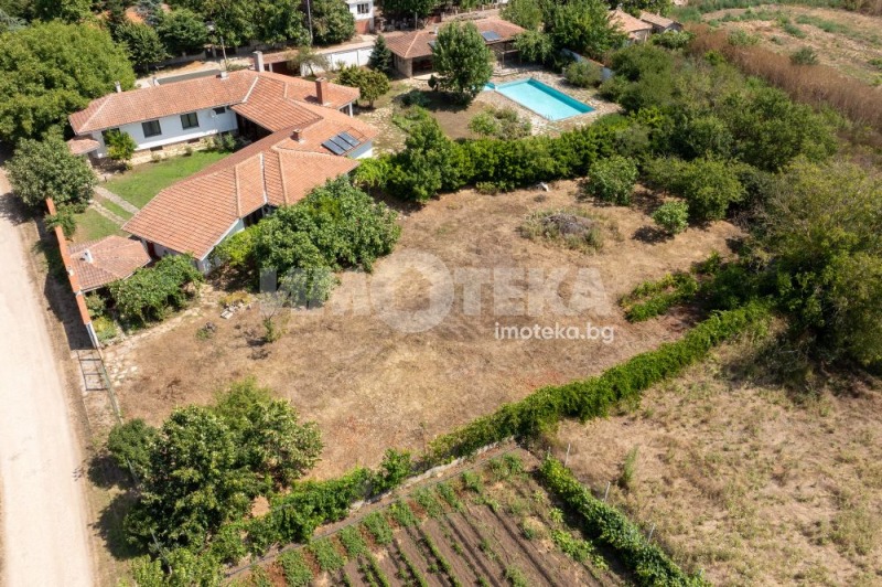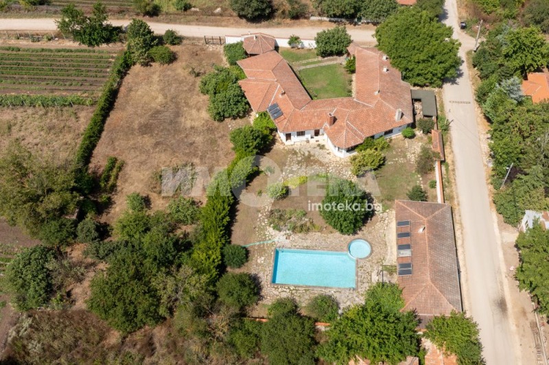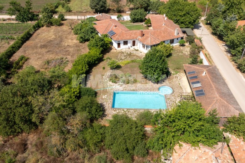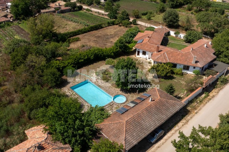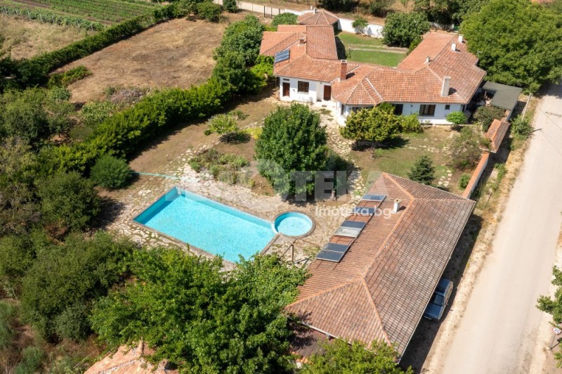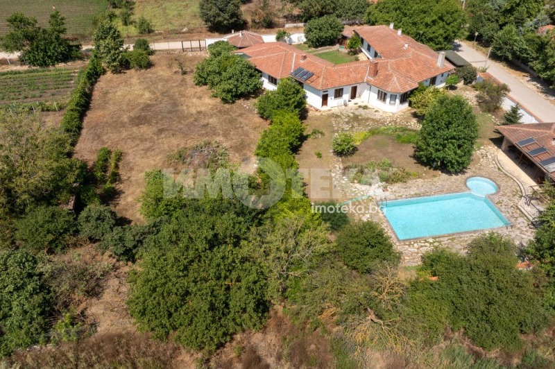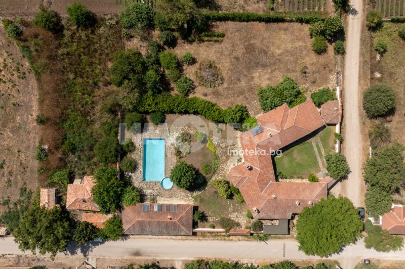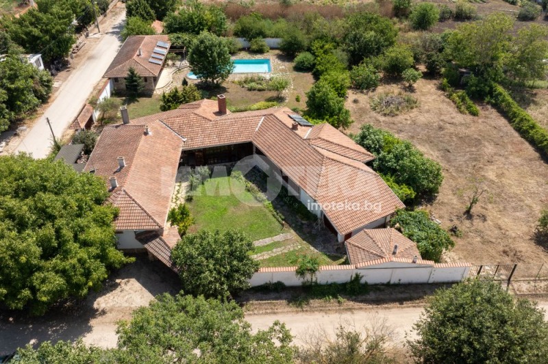 Втора сграда изградена изцяло от ръчно дялан камък, включва: една стая с баня, три гаража, просторен навес с изглед към басейна използваем целогодишно, масивна лятна кухня (20 кв.м) с каменна декорация отделна от основната сграда