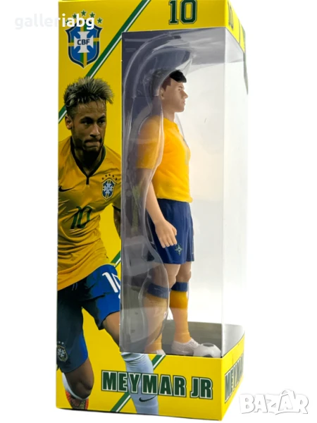 Neymar Jr. с екип на националния отбор на Бразилия – жълта фланелка с №10, тъмносини шорти и футболна топка. Моделът е поставен върху стойка и е изработен с внимание към детайла – включва името на играча, номера, герба на отбора и автентична визия.