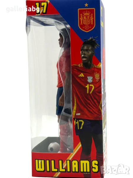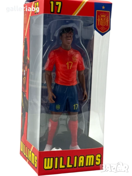 Фигурка на футболиста Williams с екип на Испания и номер 17. Моделът включва реалистична фигурка със стойка и футболна топка, поднесена в кутия с визия на националния отбор. Подходяща за колекция или подарък на фен на футбола.