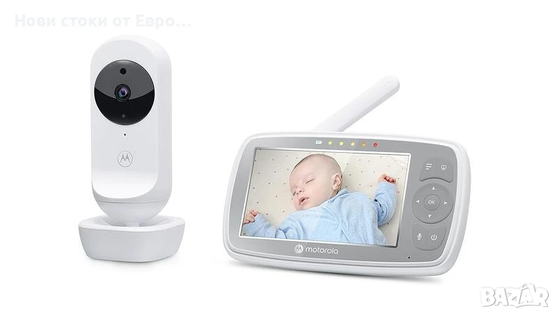 Видео бебефон Motorola VM44 Connect с Wi-Fi Бъдете винаги свързани с Вашето мъниче чрез Wi-Fi видео бебефона Motorola VM44, с двупосочната аудио връзка Вие винаги ще имате възможност да говорите на бебето си, дори и от съседната стая. Можете да наблюдавате малкото си съкровище от екрана на 4,3-инчовото родителско устройство или от мобилен телефон, като свалите приложението Motorola Nursery. Родителското устройство е с 2.4GHz FHSS безжична технология, гарантираща безпроблемна и кристално чиста връзка с бебешката камера, разполага с функция за мониторинг на стайната температура и индикатор за нивото на звука. Зоната на обхват между родителското и бебешкото устройство е до 300 метра на открито и 50 метра на закрито, като има интегрирана функция за сигнализация при излизане извън обхват и за изтощена батерия на монитора (2000 mAh акумулаторна батерия с 5 часа възпроизвеждане). С помощта на приложението Motorola Nursery и активиран Wi-Fi се наслаждавате на HD (720p) видео предаване. Бебешката камера разполага с 2x цифрово увеличение, инфрачервено нощно виждане и откриване на движение и звук в стаята.ХАРАКТЕРИСТИКИ: 4,3" LCD цветен дисплей с резолюция 480 px x 272 px; 2.4GHz FHSS безжична технология; Обхват до 300 метра на открито и 50 метра за закрито; Родителско устройство: 2000 mAh акумулаторна батерия; Живот на батерията: 5 часа; Индикатор за нивото на звука; Мониторинг на стайна температура с предупреждения за промяна; Известие за изтощена батерия; Известие за извън обхват; Стойка за родителския модул; 2x цифрово увеличение; Инфрачервено нощно виждане; Музикална кутия: приспивни песни, аудиоприказки и лични записи; Двупосочен разговор; Високочувствителен микрофон; Възможност за монтаж на стена на бебешкото устройство; ПРИЛОЖЕНИЕ MOTOROLA NURSERY: Безплатно 24-часово наблюдение и стрийминг; Дневник на бебето за проследяване на неговото развитие; Откриване на движение, звук и температура с известия; Правене на снимки и видеоклипове директно от излъчването на живо; Споделяне на събития, снимки и видеоклипове с приятели и семейство направо от приложението;