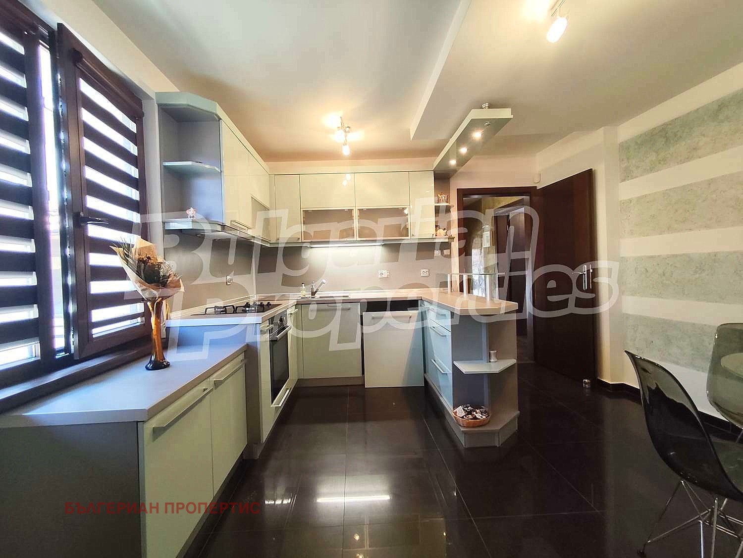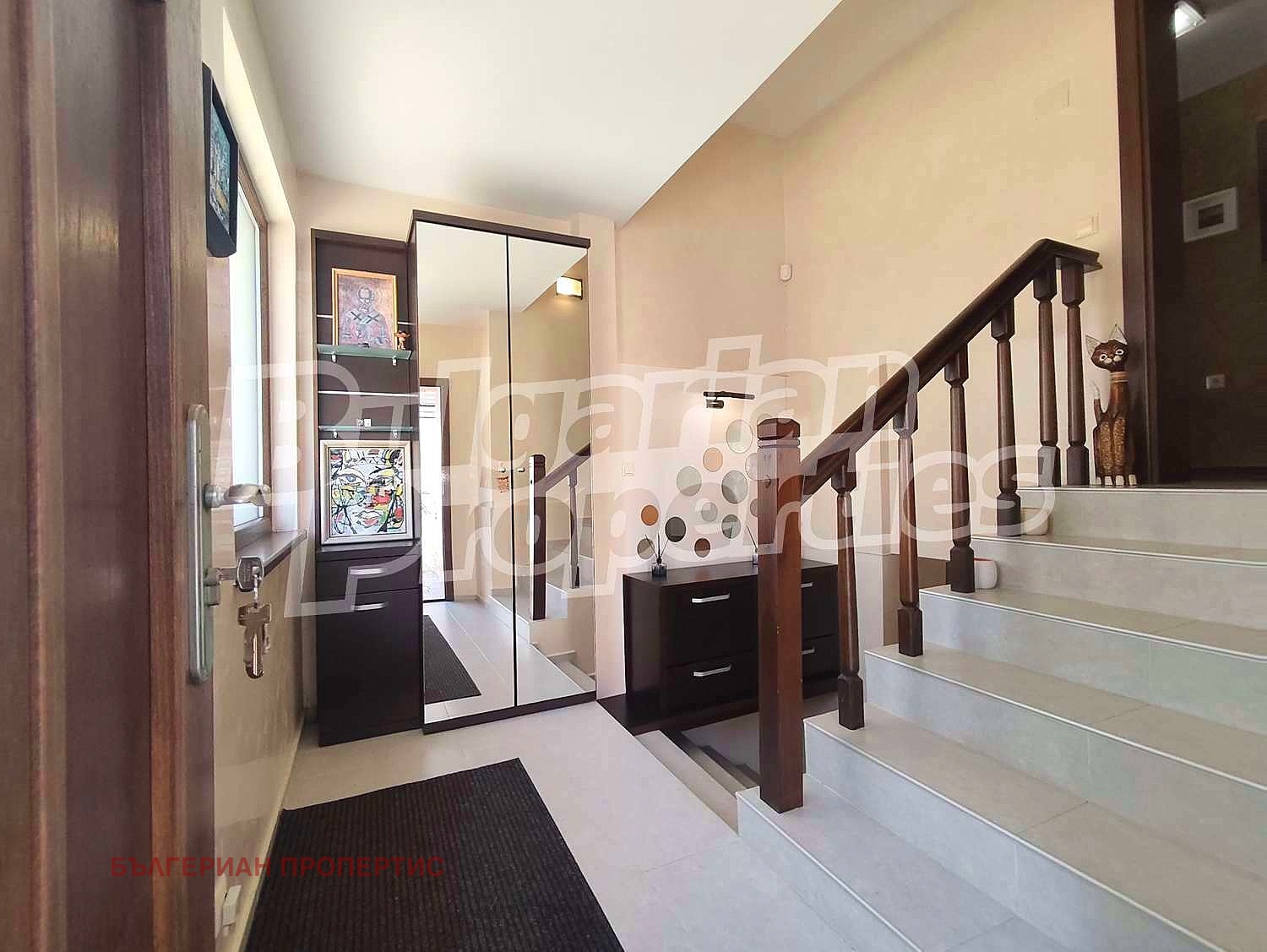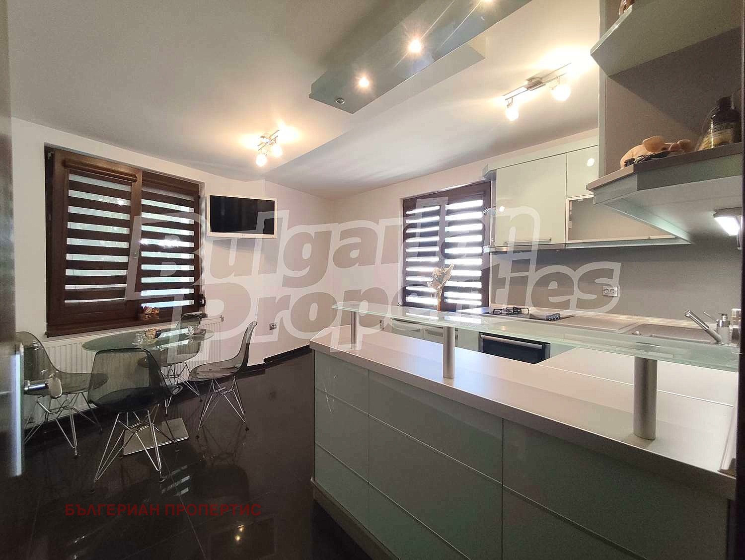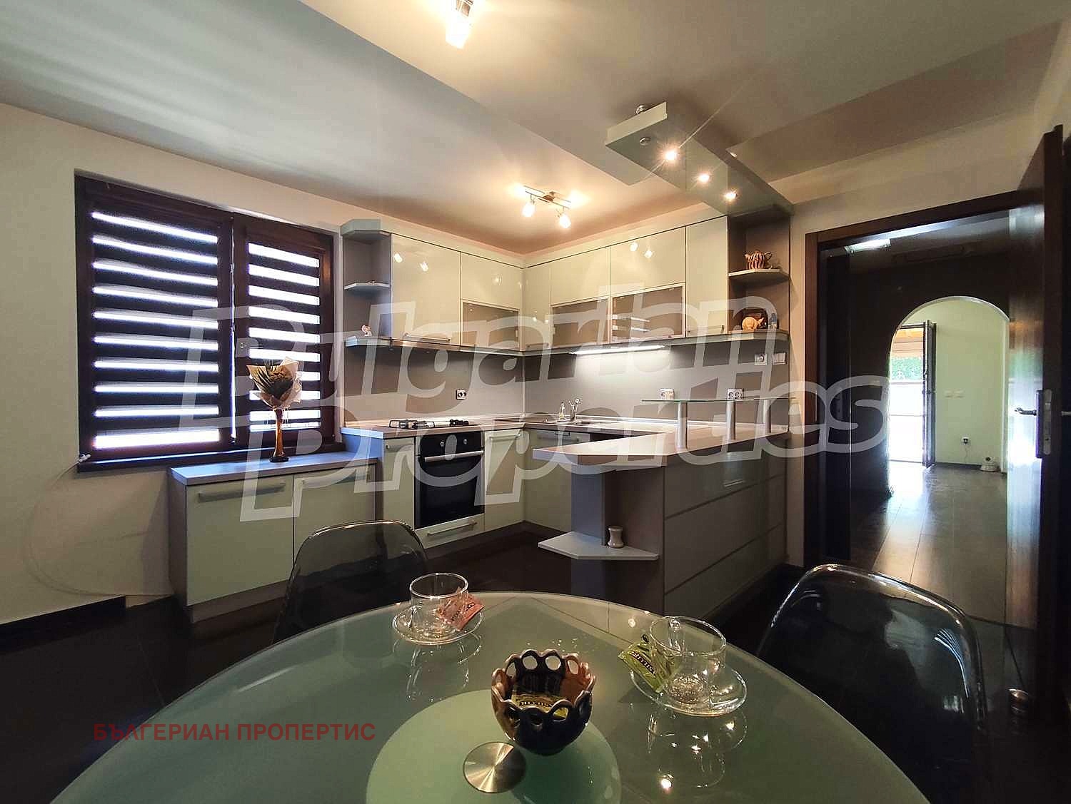 Първи етаж - просторно антре с вътрешно стълбище между етажите, коридор, светла дневна с трапезария и кухня с кът за хранене, самостоятелна спалня, всекидневна и хол с преход към остъклена веранда;