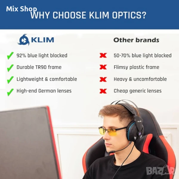 очила, проектирани с немска технология, филтрират 92% от синята светлина при 400 nm, много по-високо от средното за индустрията. Защитете се още днес!