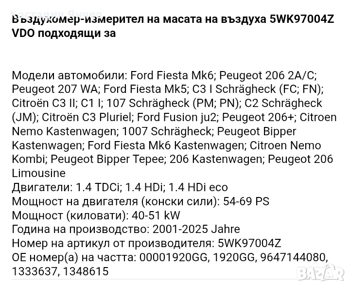 дебитомер за Пежо Ситроен hdi -5wk97004-9647144080.53456.внос