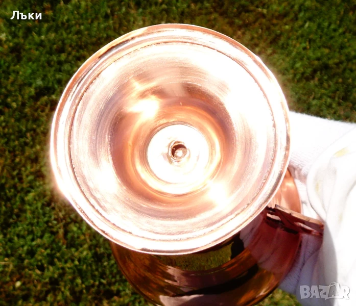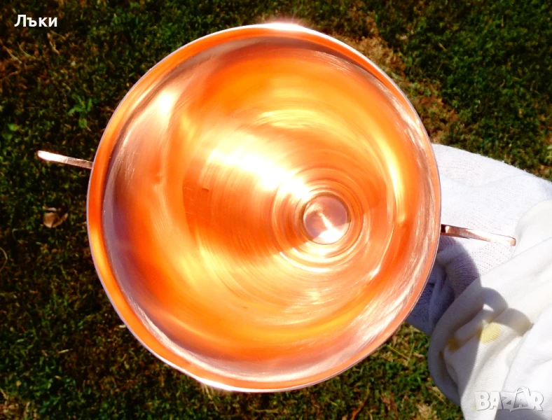 дизайн.Вътре не е калайдисана,подходяща за медна вода.Височина 15 см.,диаметър