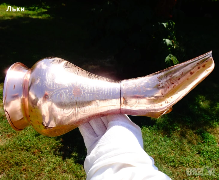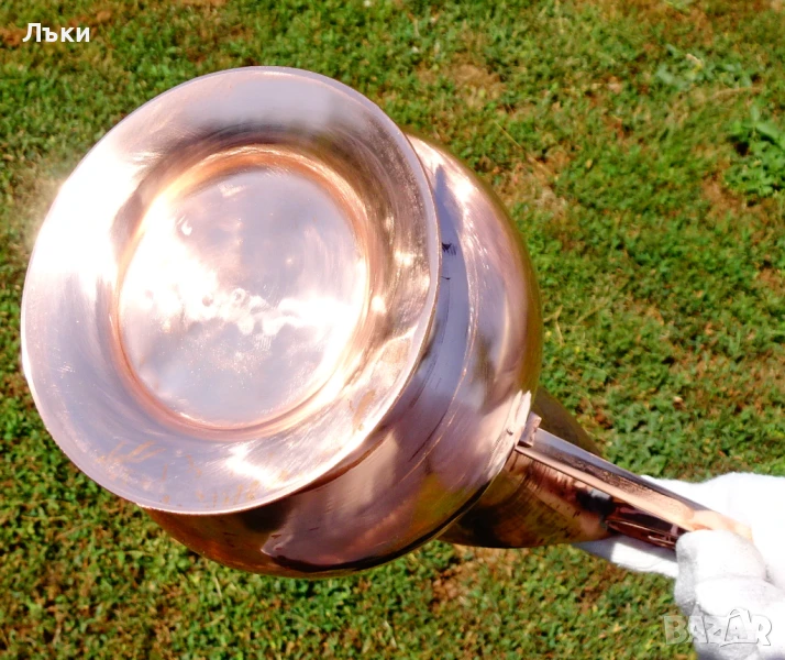 блясъка не се виждат добре на снимките.Има ефектно извита медна дръжка стабилно