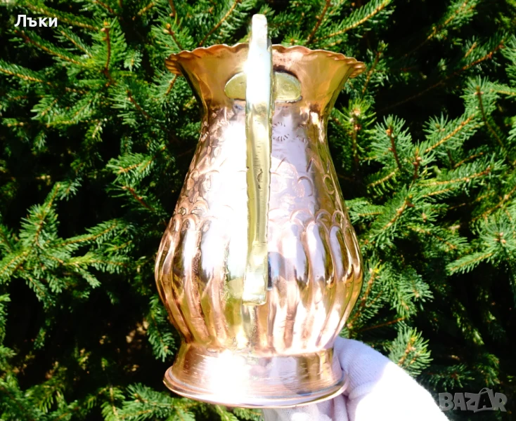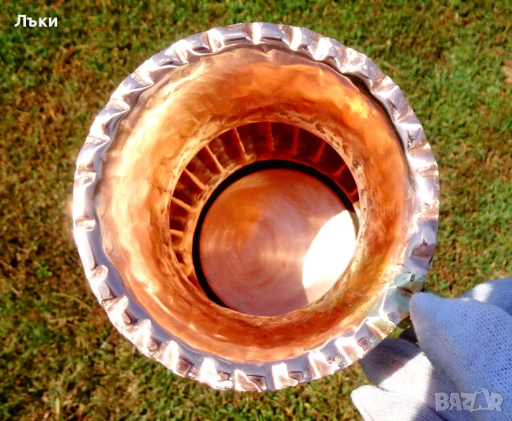 вътре не е калайдисана,подходяща за медна вода.Височина 17 см.,диаметър 11 см.,дължина