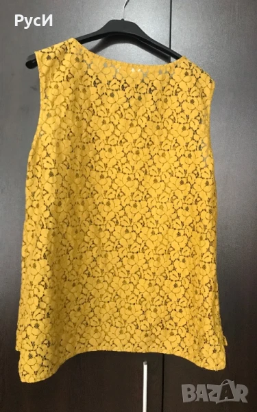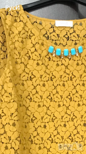 Топ от дантела в цвят горчица, декорирация в тюркоазено около врата,