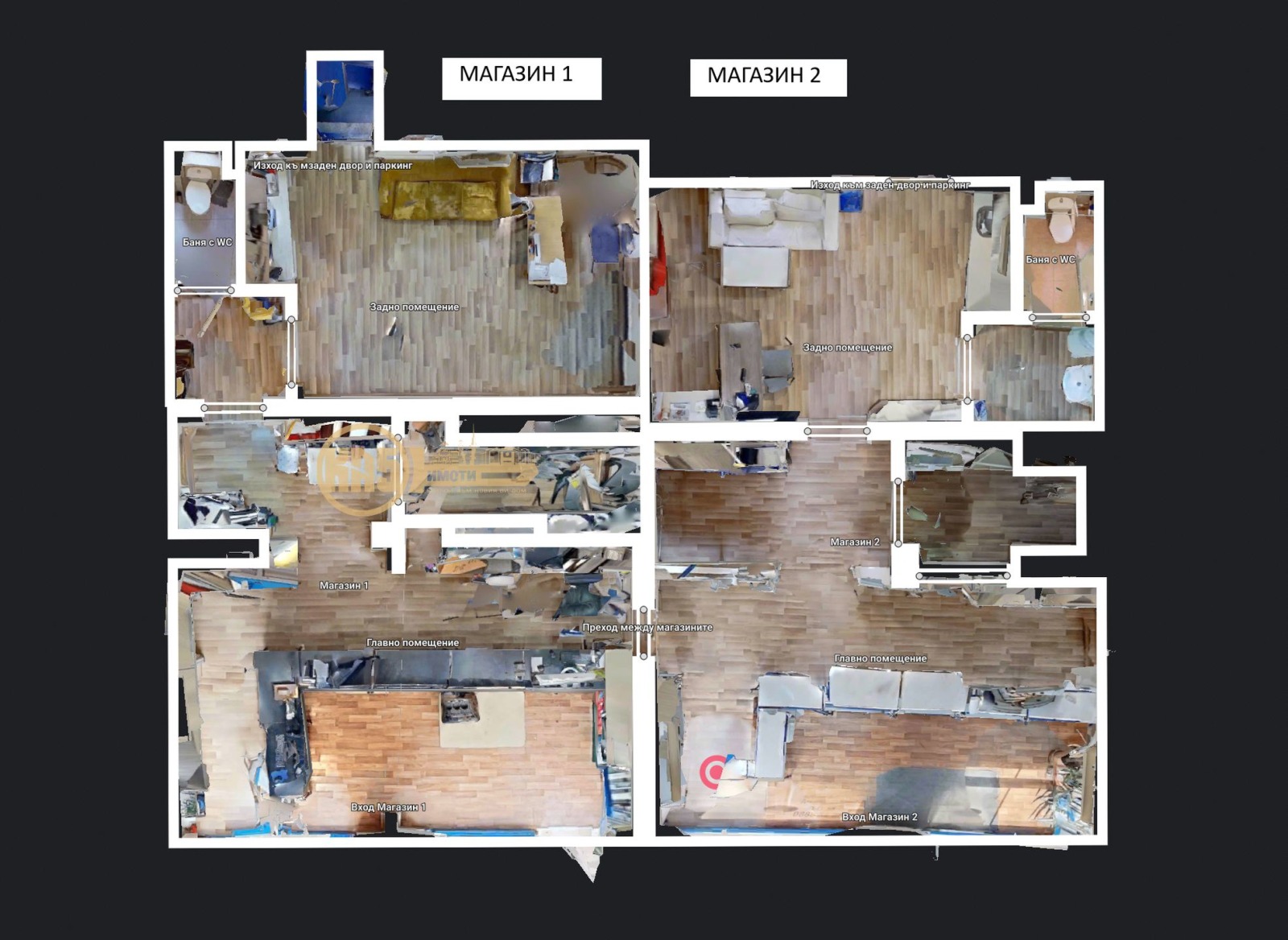 Двата магазина са огледални. Разполагат с голямо помещение отпред и по-малко (офисно) отзад. Има стилажи, които играят ролята на предградна стена, но могат да се махнат и главното помещение да стане още по-голямо. Всеки магазин има мазе от 16 кв.м., отделна за себе си задна врата към паркинга и отделна баня с тоалетна.