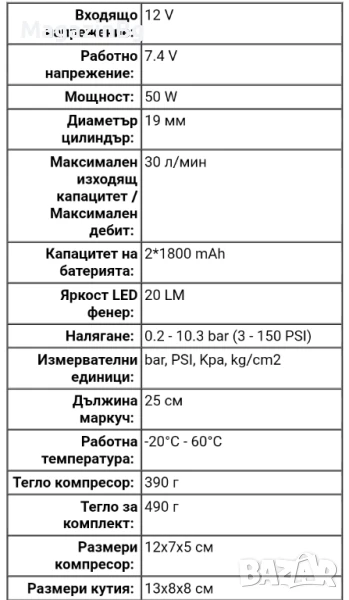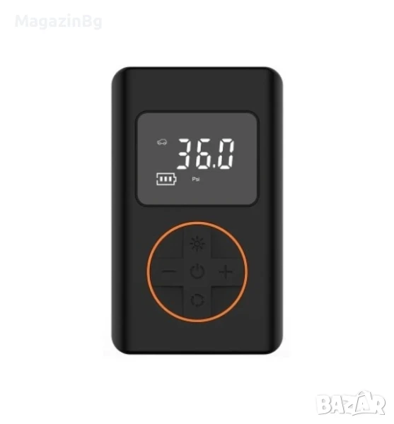 Акумулаторен мини компресор, подходящ за помпане на различни видове гуми (на автомобили, велосипеди) с вентили тип Schrader и Dunlop, топки (футболни, баскетболни, волейболни, хандбални, гимнастически и други), балони, както и надувни помощни средства за водни спортове. Функция за показане на налягането в реално време на дисплея и за предварителен избор на целево налягане, при достигане на което помпаненето се прекъсва автоматично. Комплектът съдържа най-често срещаните накрайници - игла за топка, накрайник за гимнастически топки и надувни помощни средства за водни спортове, накрайник за вентил Dunlop, накрайник за балони. Вградената LED светлина подобрява видимостта на работната зона. Комплектът съдържа също USB кабел с дължина 30 см (Type-A – Type-C) и потребителска картонена кутия.
