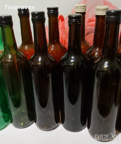 Продавам 30 броя бутилки с винтови капачки- 25 тъмни и 5 от бяло, прозрачно стъкло, без етикети, съвсем чисти- измити и подсушени, останали от вино и ракия, сервирани на тържество (еднократно използвани). Може да им се залепят етикети.