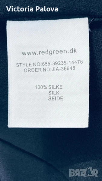 Redgreen спазва принципите на скандинавския дизайн: минимализъм, високо качество, функционалност, елегантност. Роклята е права, дължината ѝ е 96см, рамо - 52см, ГО - 52см. Тъмносиня коприна, подплатата е също 100% коприна. Логото на марката е в страничния шев на роклята.