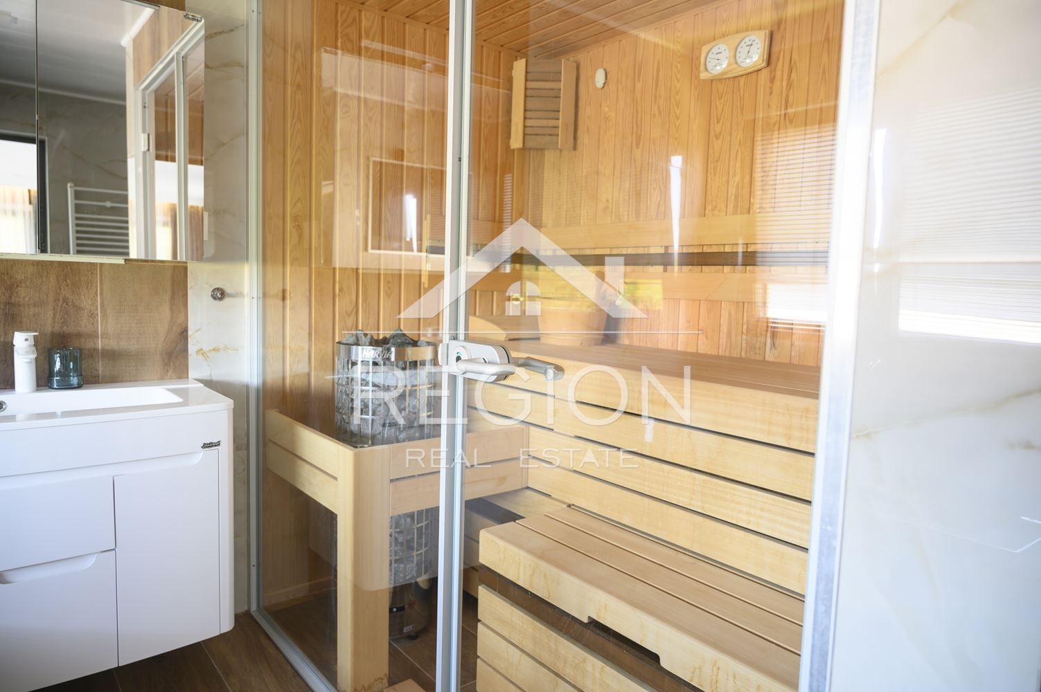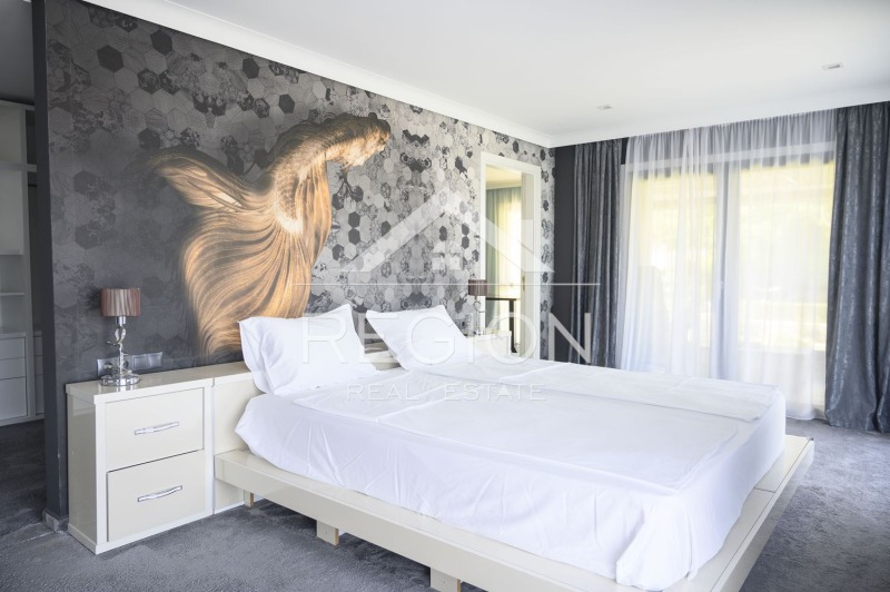 5. Сауна,парна кабина с душ кабина,джакузи за двама и телевизор в огромна баня към мастър спалня с гардеробна и работен кабинет с бюро и библиотека.