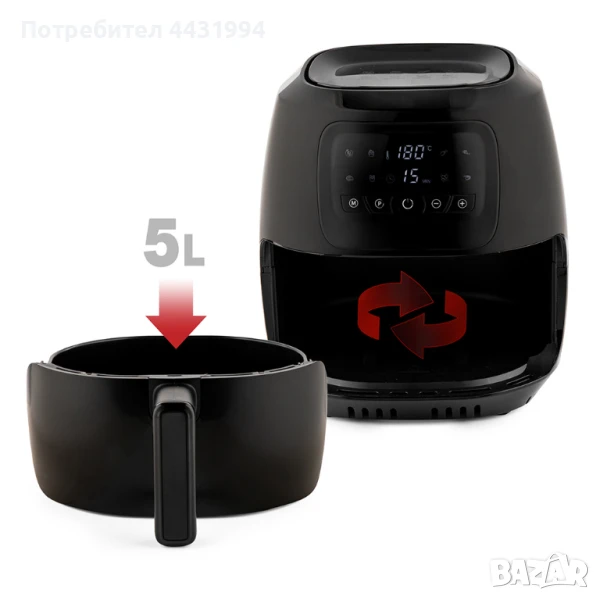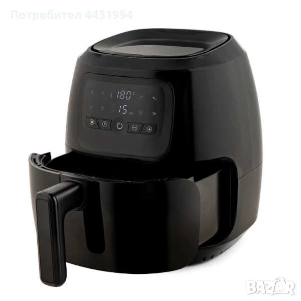 Oбем на купата - 5L Полезен обем – 4.2L (с решетката) Размер на купата: 239x228x97.5 mm Размер на решетката: 226x215 mm Таймер – 60 мин. Автоматични програми за готвене: Пилешко бутче, Пържола, Риба, Десерт, Зеленчуци, Пържени Картофи, Скариди. Регулиране на температурата 80-200℃ Кошница и решетка с незалепващо покритие Автоматично подновяване на готвенето след изваждане на купата. LED дисплей Широк сензорен екран Сигнал за край на готвенето Гумирани крачета против хлъзгане 1500W, 220-240V, 50-60 Hz