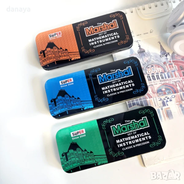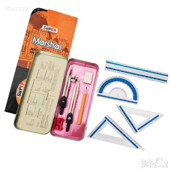 Геометричен комплект Marshal в метална кутия за съхранение – всичко необходимо за чертане и измерване!