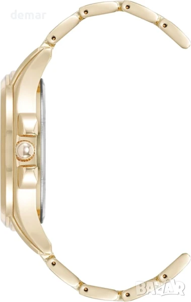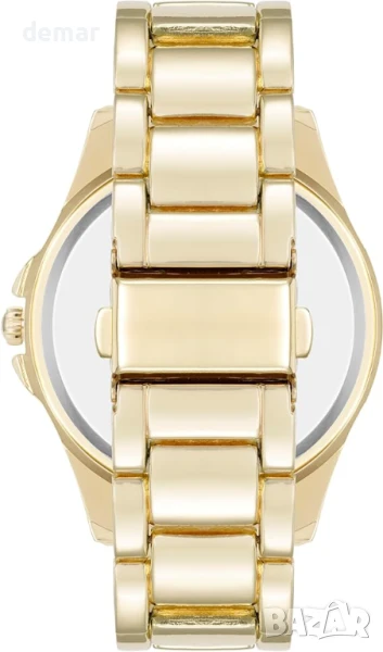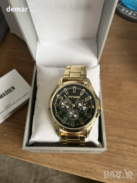 Този мъжки часовник тип гривна е със зелен циферблат с ефект „слънчеви лъчи“ и златисти стрелки, маркери и нефункционални подциферблати, всички защитени от минералнокристална леща. Включва златиста регулируема гривна с двойно заключваща се закопчалка и бял външен минутен стрелков пояс. Забележка: не е водоустойчив.