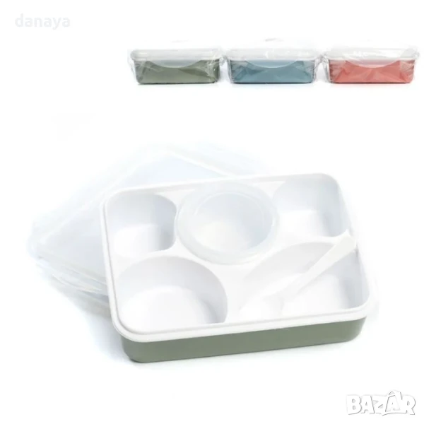 Кутия за храна с 5 отделения, прозрачeн капак и подвижна купичка за сос – компактна и удобна за обяд, училище или пътуване