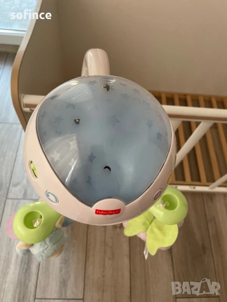 Въртележката е снабдена с прожектор, който прожектира звездички по стените и тавана на детската стая.