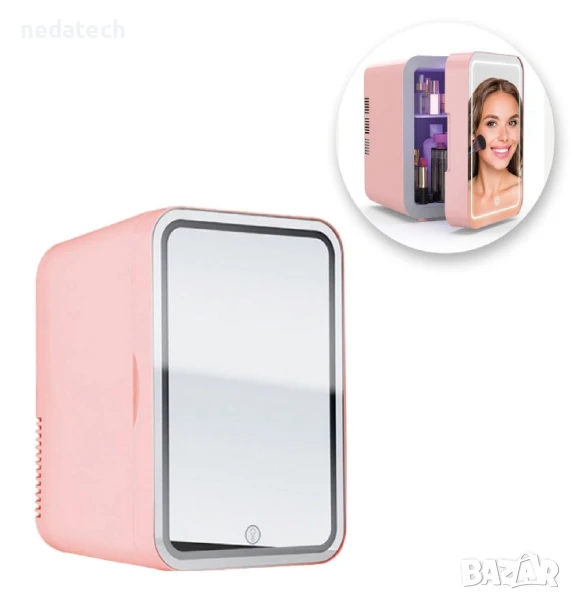 Мини козметичен хладилник с капацитет 4 литра, за да поддържате козметиката си винаги в отлично състояние. Работи с променливотоков захранващ кабел, а включен е и DC кабел за кола. С променливотоково захранване 100-240V 60hz 30-36W и температура 15-20ºC под околната температура и минимална температура 3ºC (в зависимост от околните условия), той е подходящ и за закуски. Превключването от студено към топло е лесно. Вратата има осветено огледало с тъч превключвател и 3 степени на интензитет на светлината. Вътрешният рафт може да се сваля, за да се адаптира към вашите нужди, има нисък шум и е екологичен, тъй като е 100% без фреон. Малък е и преносим, което го прави много лесен за транспортиране. Вътрешните размери са 20x14x13см.