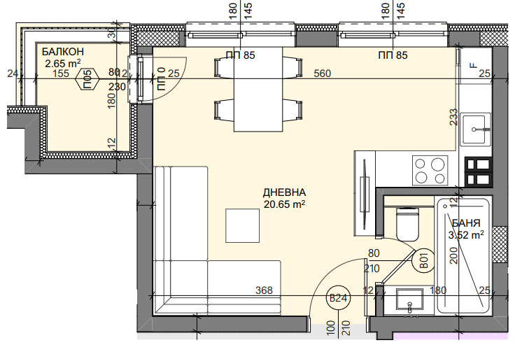 Имотът е с обща площ от 37.57кв.м и се състои от: дневна с кухня и трапезария, балкон, баня с тоалетна. Към всеки имот ще бъдат включени съответните идеални части от общите части на сградата, както и от земята върху която ще бъде изграден обекта.