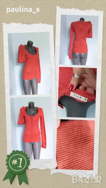 2️⃣. Колаж / S / XL - "Vila". Цената е крайна 29,99лв / 15 евро. Оранжева пухкава жилетка със съдържание на заешка вълна, вискоза и примеси, много еластична до XL. Цветът е Праскова. Не чисто нова, но е без дефекти, отрязан етикет за състав, съобразена цена! Поради голямата еластичност може да се носи от няколко размера. Моделът се вижда добре, класика в жанра. Уникална е на живо и много мека на допир.