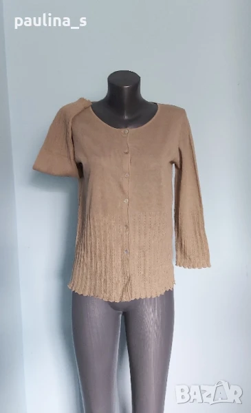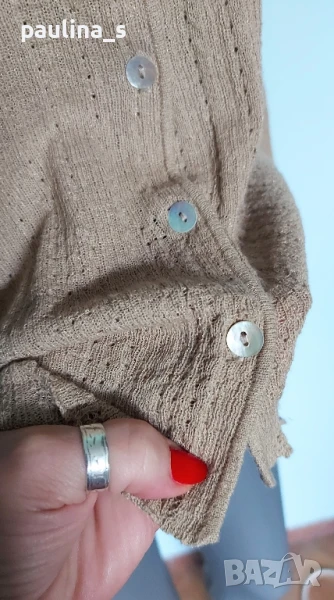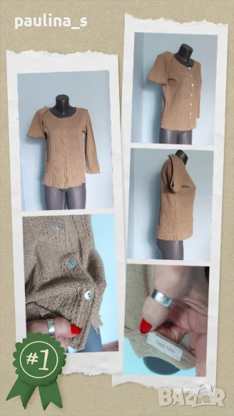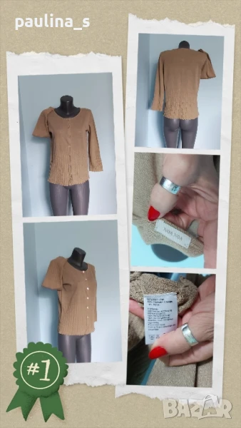 3️⃣. Колаж / XL / 3XL - "Fransa". Цената е крайна 29,99лв / 15 евро. Уникална златиста жилетка със златисто ламе в преждата. Плетивото има еластичност и покрива няколко размера до 3XL, съдържа лен, държи прохладно и не поти. Копчетата са уникални, от естествен седеф Абалон, всяко едно е като бижу. Цветът е Охра. Плетивото е два вида, долната част е рехаво и стои като дантела, ръкавите са 7/8. Класика в жанра, изключително изискана дреха.