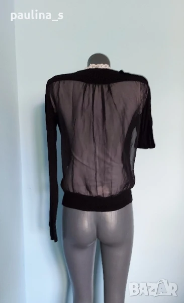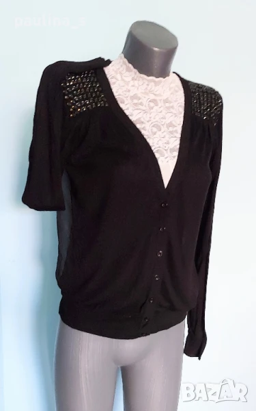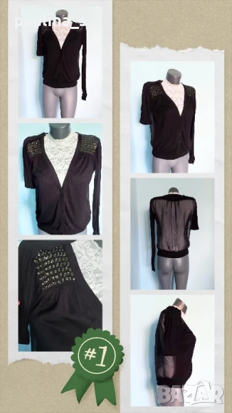 4️⃣. Черна жилетка с камъни и прозрачен гръб. Цената е крайна 29,99лв / 15 евро. Уникална жилетка за повод или офис с ръчна декорация от камъни на раменете и прозрачен гръб от копринен шифон. Трикото е нежно и еластично памук и вискоза, много еластично и приятно за носене. Премахнати са етикетите, съобразена цена. Моделът се вижда добре. Без дефекти, една бройка. Отпред е трико / нежно плетиво, дава еластичност и покрива няколко размера.