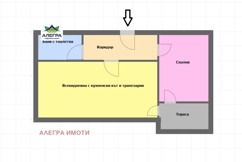 Алегра Имоти предлага на Вашето внимание двустаен апартамент, разположен на първи жилищен етаж в новострояща се пететажна кооперация с асансьор, намираща се между широкия център на Пазарджик и кв. Ябълките.