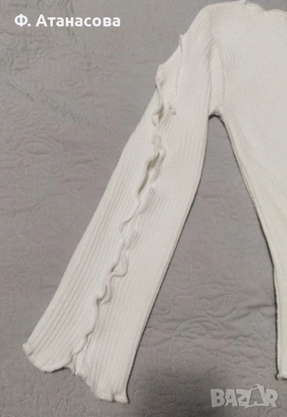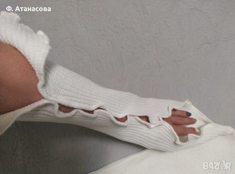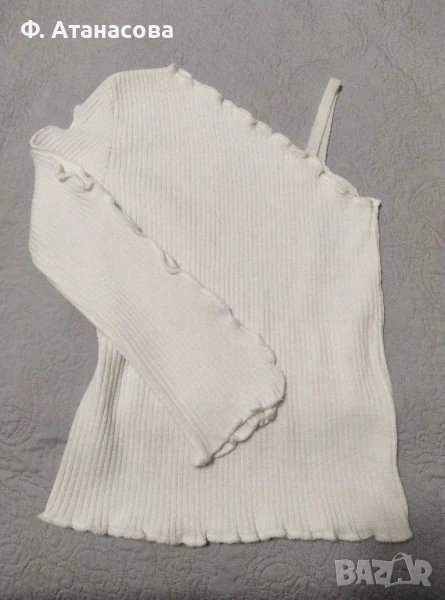 Уникален модел пуловер за летните вечери и ранната есен! Моделът е асиметричен - с един ръкав от едната страна и презрамка от другата. Ръкавът е с интересни прорези, които го правят много ефектен.