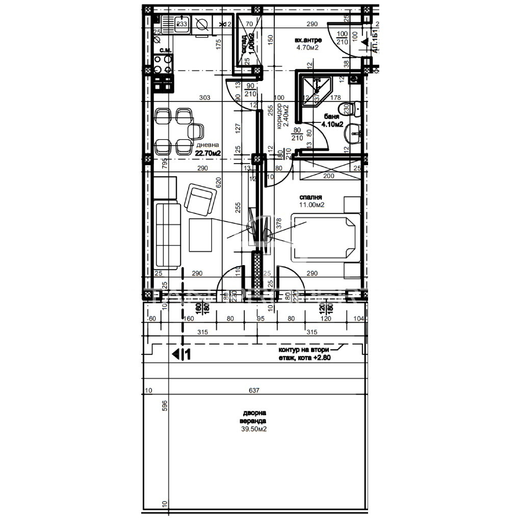 Имотът е ситуиран на 1-ви жилищен етаж и разполага с обща площ 60 кв.м. кв.м., разгърната по следния практичен начин: Входно антре, дневна, спалня, баня с тоалетна, склад и дворна веранда с площ 39.50кв.м. Има възможност за закупуване на паркомясто.