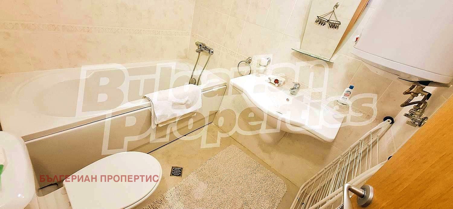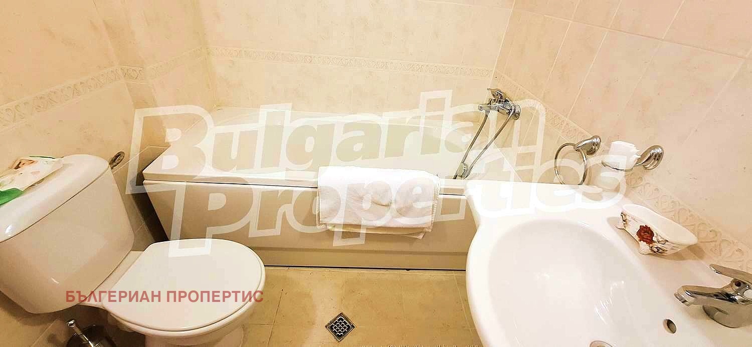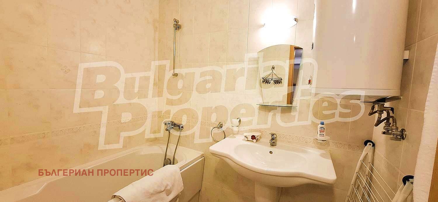 Банята е завършена с внимание към детайла разполага с мивка с огледало, тоалетна и вана с душ, осигуряваща удобство и комфорт.