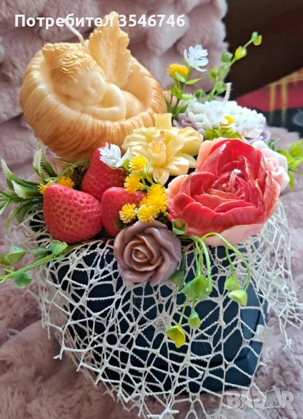 Красива аранжировка в кутия сърце. Подходящ подарък за кръстници, за изписване на бебе, за бъдещи родители.. Или просто така, защото е красив. Направен от соев восък и добавени изкуствени цветенца и зеленина.