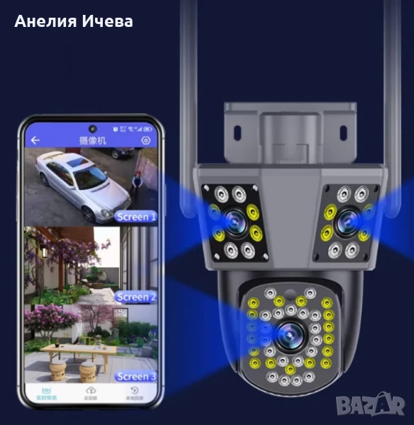Тройна WiFi Smart камера за наблюдение. Kарта връзка предлага висока резолюция от 9 MP и Ultra HD качество на изображението. Подходяща както за вътрешно, така и за външно използване, камерата разполага с 5-кратно оптично увеличение (Zoom) и ротационна функция за 360° панорамен изглед. Оборудвана е с LED светлина за нощно виждане, сензор за движение и алармена система за засичане на нежелани обекти. Камерата се захранва чрез DC-12V и поддържа както WiFi свързаност за лесно управление и наблюдение на живо през мобилно устройство.